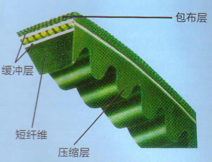 D:短纖維:根據(jù)切邊V帶的使用要求:底膠膠料應(yīng)具有硬度大、強(qiáng)力高、耐疲勞性好、不易斷裂、橫向剛性和縱向柔性好,耐老化等特點(diǎn),為此在底膠膠料中摻用了短纖維,通過(guò)出片機(jī)壓延,使短纖維排列與V帶運(yùn)轉(zhuǎn)方向相垂直的設(shè)置底膠的方法增大了V帶的橫向剛性同時(shí)也提高了底膠強(qiáng)力,硬度和耐磨性,增大了V帶與帶輪的摩擦力。